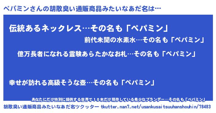 | 男性向けラノベタイトル風あだ名 | 『ペパミン~年齢イコール彼女いない歴の魔法使い~』 |