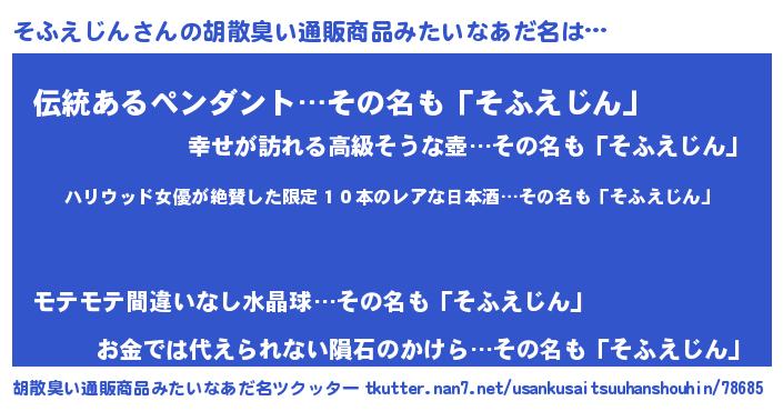 | 意味不明あだ名 | 『住所不定無職そふえじん(14歳)』 |