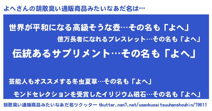 | ヘコむあだ名 | 『よへお』『なまこ酢』『よへもー』 |