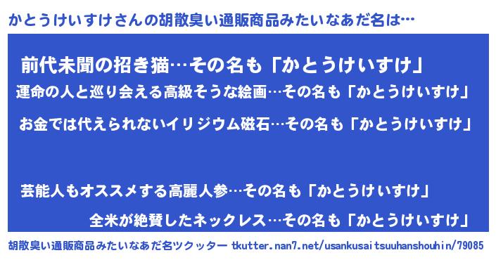 | ヘコむあだ名 | 『かとうけいすけ(爆)』『かと太郎』 |