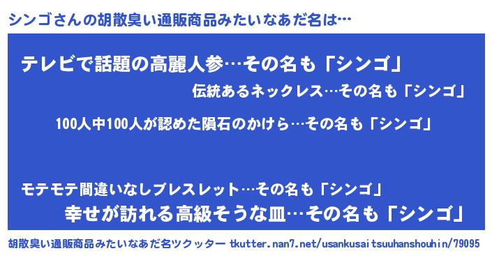 | 男性向けラノベタイトル風あだ名 | 『シンゴスレイヤー』 |