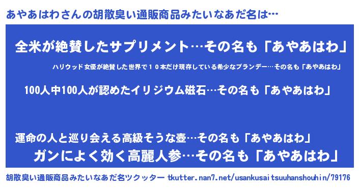 | 男性向けラノベタイトル風あだ名 | 『おまえをオタクにしてやるから、俺をあやあはわにしてくれ! 』 |