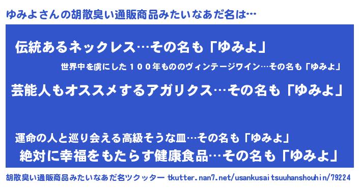 | 男性向けラノベタイトル風あだ名 | 『ゆみよ~年齢イコール彼女いない歴の魔法使い~』 |