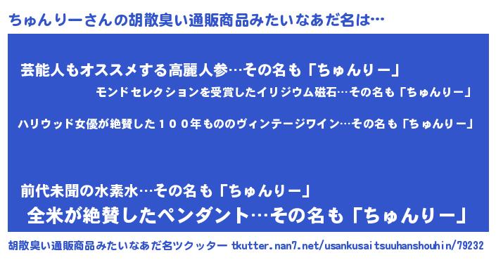 | ヘコむあだ名 | 『ちゅ太郎』『ちゅんりー(遠い目)』 |