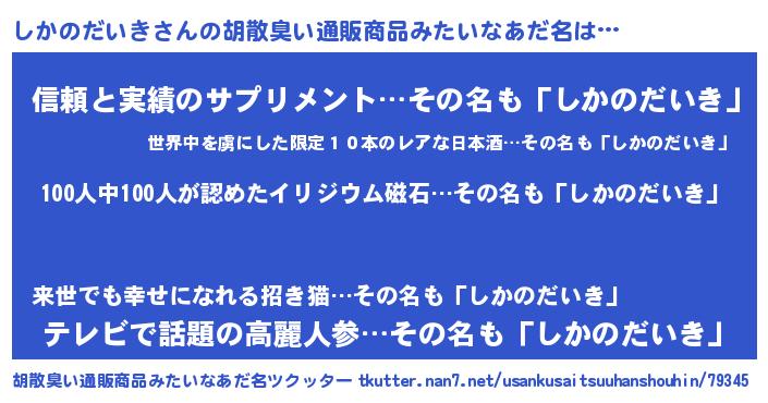 | ヘコむあだ名 | 『しかっ子』『しかのだいき(小並感)』 |