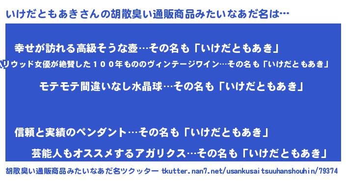 | 男性向けラノベタイトル風あだ名 | 『いけだともあきに滅ぼされるだけの簡単なお仕事です』 |