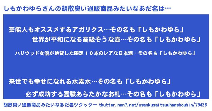 | 意味不明あだ名 | 『住所不定無職しもかわゆら(41歳)』 |