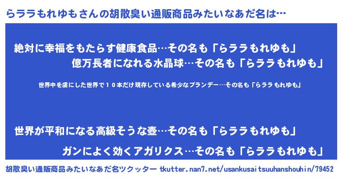 | 意味不明あだ名 | 『住所不定無職らララもれゆも(71歳)』 |