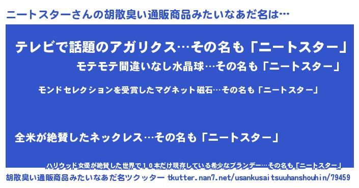 | 男性向けラノベタイトル風あだ名 | 『ノーゲーム・ノーニートスター』 |