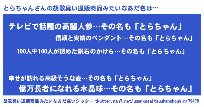 | 男性向けラノベタイトル風あだ名 | 『おまえをオタクにしてやるから、俺をとらちゃんにしてくれ! 』 |