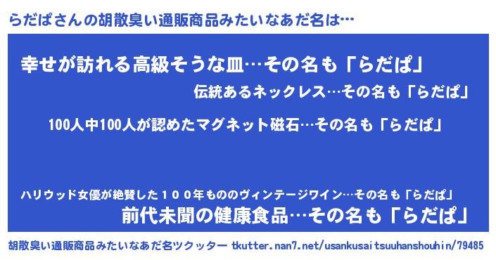 | 男性向けラノベタイトル風あだ名 | 『おまえをオタクにしてやるから、俺をらだぱにしてくれ! 』 |