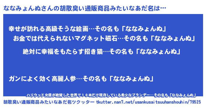 | 男性向けラノベタイトル風あだ名 | 『ななみょんぬという概念が存在しない退屈な世界 』 |