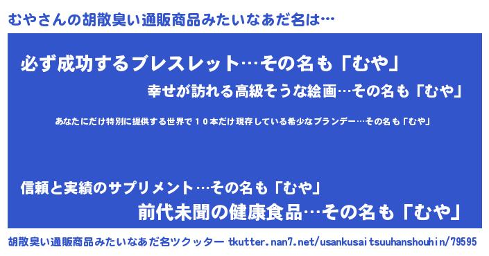 | 男性向けラノベタイトル風あだ名 | 『この素晴らしい世界にむやを!』 |