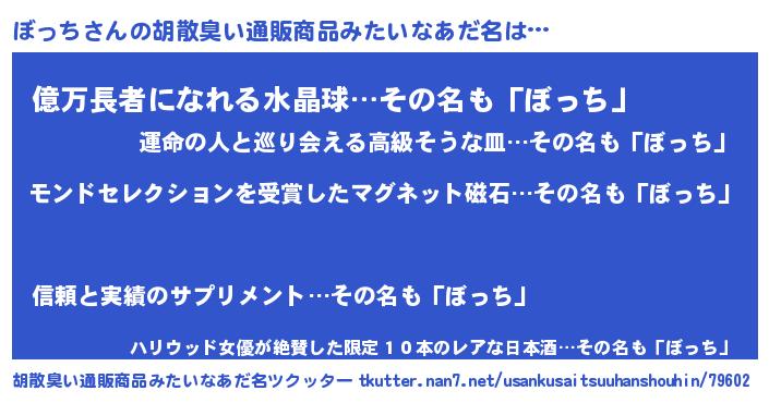 | ヒーロー風カッコイイあだ名 | 『慈愛の使者ぼっち』『スーパーボッチ』 |