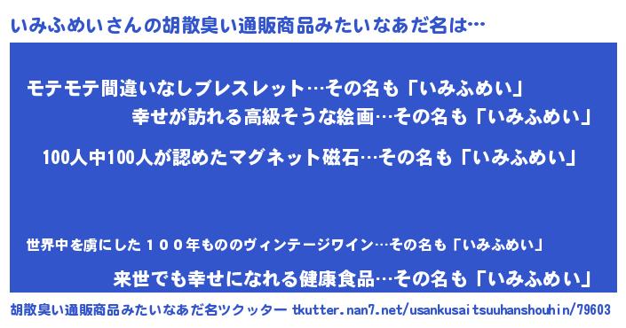 | ヘコむあだ名 | 『いみにー』『いみふめい(笑)』 |