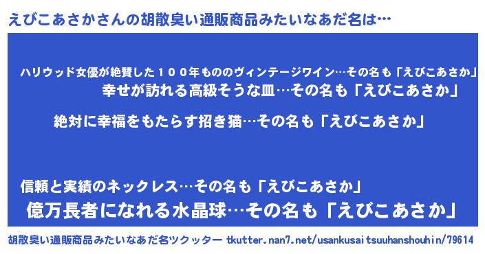 | 男性向けラノベタイトル風あだ名 | 『えびこあさかという概念が存在しない退屈な世界 』 |