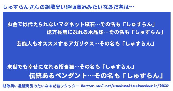 | 意味不明あだ名 | 『自称しゅすらん』『ペロリンしゅすらん』 |
