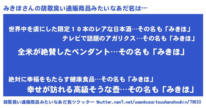 | 男性向けラノベタイトル風あだ名 | 『みきほの嫁は女の子じゃないと思った?』 |