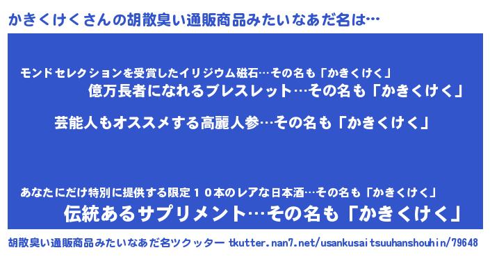 | 男性向けラノベタイトル風あだ名 | 『Re:かきくけくから始める異世界生活』 |