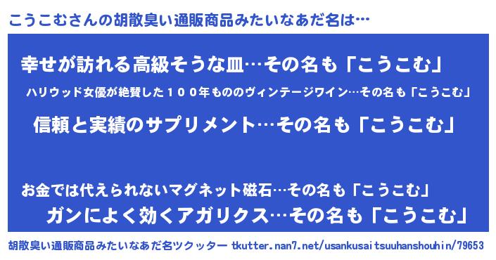 | 女子向けラノベタイトル風あだ名 | 『こうこむは平凡を望む』『闇のこうこむ』 |