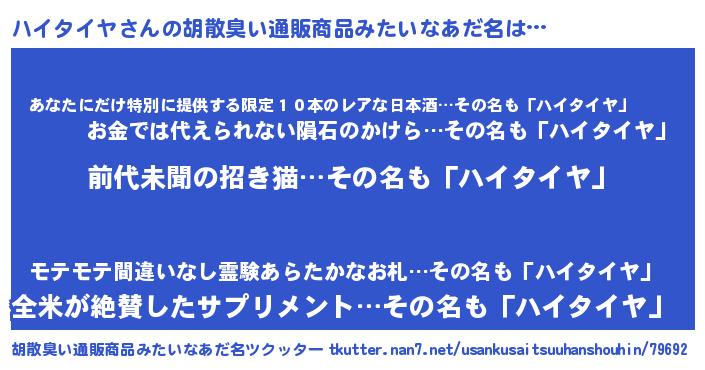 | 男性向けラノベタイトル風あだ名 | 『うちのハイタイヤが世界を掌握している!』 |