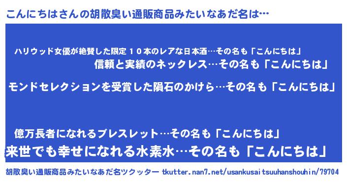 | 男性向けラノベタイトル風あだ名 | 『こんにちはに滅ぼされるだけの簡単なお仕事です』 |