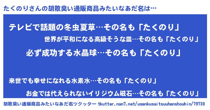 | 男性向けラノベタイトル風あだ名 | 『タクノリスレイヤー』『たくのりの憂鬱』 |