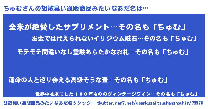 | 男性向けラノベタイトル風あだ名 | 『ちゅむの憂鬱』『はたらくちゅむさま!』 |
