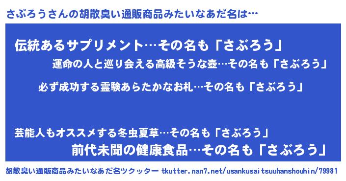 | 意味不明あだ名 | 『ペロリンさぶろう』『永久保存さぶろう』 |