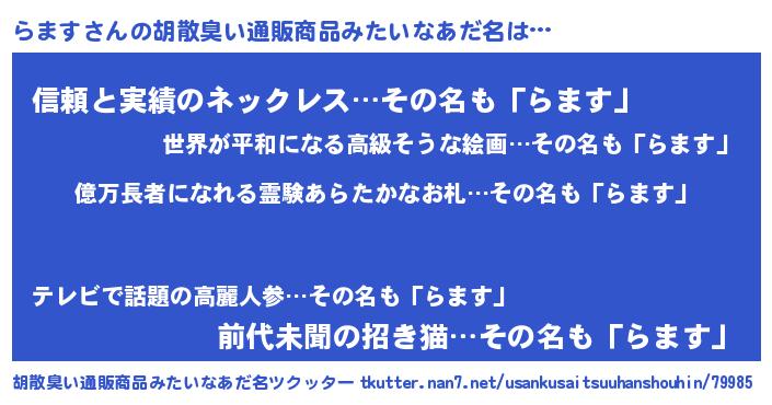 | 欧米人風あだ名 | 『マイケルらます』『ウサインらます』 |