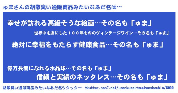 | 男性向けラノベタイトル風あだ名 | 『ゅまという概念が存在しない退屈な世界 』 |