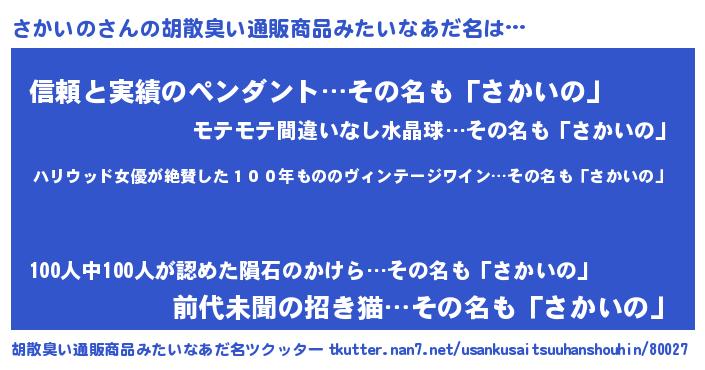 | 意味不明あだ名 | 『住所不定無職さかいの(8歳)』 |