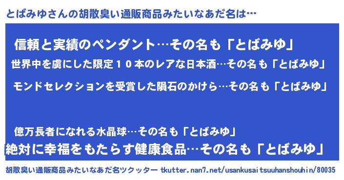 | ヘコむあだ名 | 『とばぷりん』『とばみゆ(苦笑)』 |
