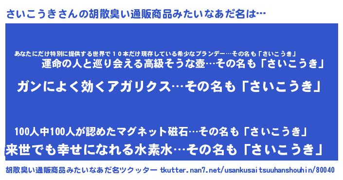 | 意味不明あだ名 | 『自称さいこうき』『永久保存さいこうき』 |