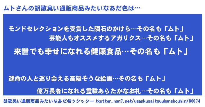 | ヘコむあだ名 | 『ムト(爆)』『ムトもー』『酢こんぶ』 |