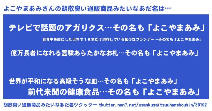 | ヘコむあだ名 | 『よこもー』『よこやまあみ(笑)』 |