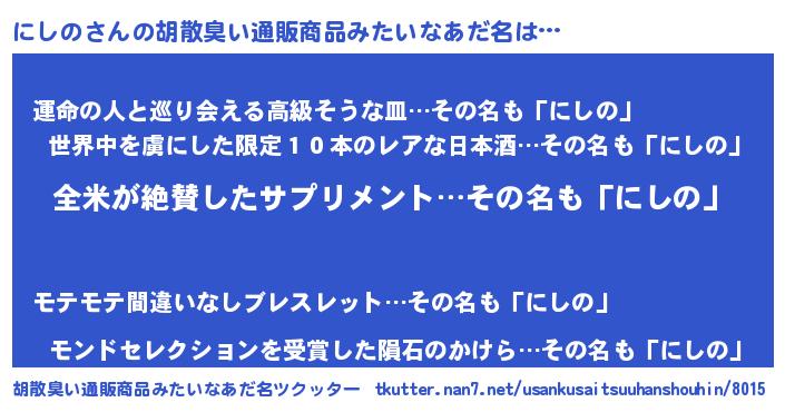 | 男性向けラノベタイトル風あだ名 | 『にしのの嫁は女の子じゃないと思った?』 |