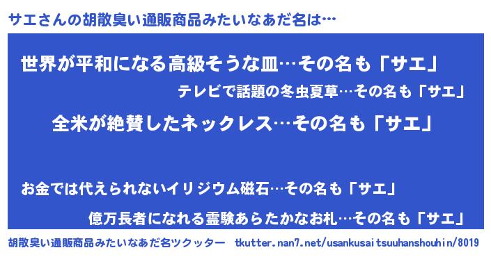 | 男性向けラノベタイトル風あだ名 | 『サエの嫁は女の子じゃないと思った?』 |
