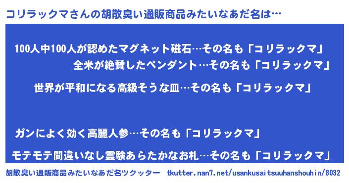 | 男性向けラノベタイトル風あだ名 | 『転生したらコリラックマだった件』 |