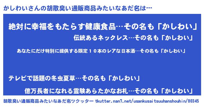 | 意味不明あだ名 | 『住所不定無職かしわい(56歳)』 |