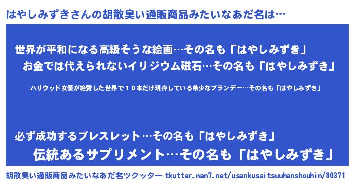 | 男性向けラノベタイトル風あだ名 | 『ハヤシミズキスレイヤー』 |