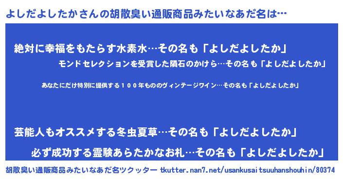 | 女子向けラノベタイトル風あだ名 | 『悪役よしだよしたかに転生したようですが、知った事ではありません』 |