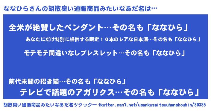| 欧米人風あだ名 | 『マイケルななひら』『ウサインななひら』 |