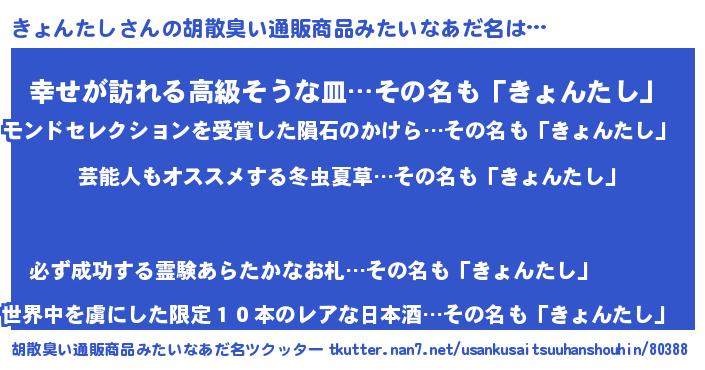 | 男性向けラノベタイトル風あだ名 | 『うちのきょんたしが世界を掌握している!』 |