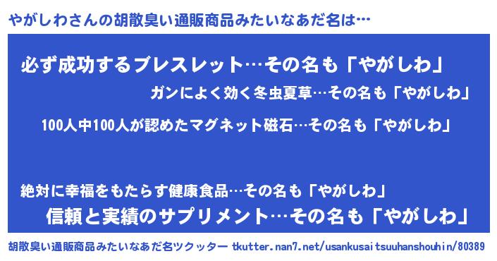 | ヒーロー風カッコイイあだ名 | 『友情の使者やがしわ』『魔戒騎士ヤガ』 |