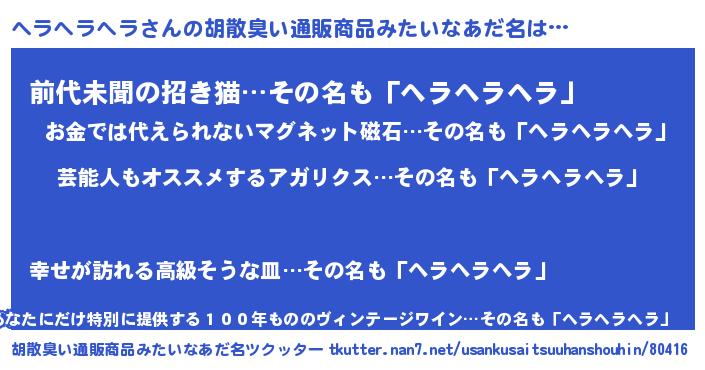 | ヒーロー風カッコイイあだ名 | 『究極戦士ヘラヘラヘラ』『仮面ヘラダー』 |