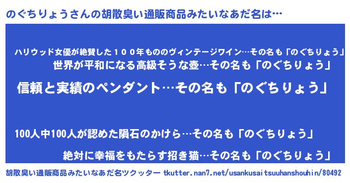 | 意味不明あだ名 | 『とにかく怪しいのぐちりょう』 |