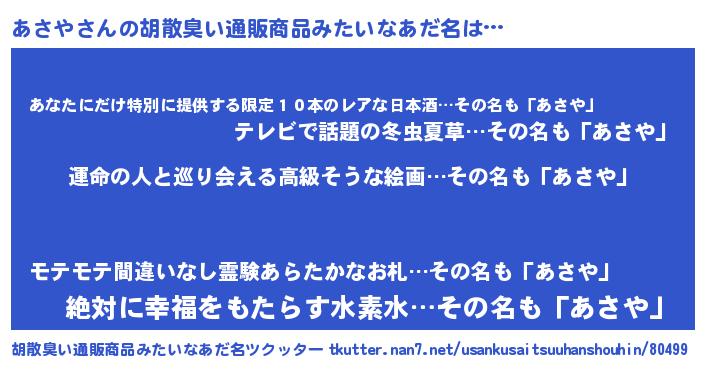 | 意味不明あだ名 | 『つくし科あさや属』『永久保存あさや』 |