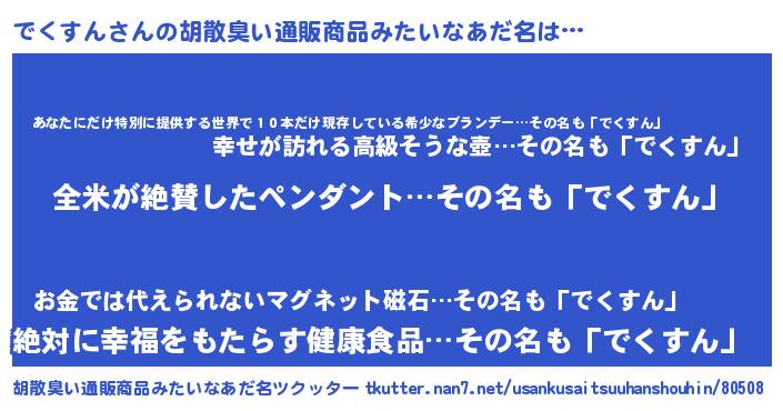 | 男性向けラノベタイトル風あだ名 | 『でくすんに滅ぼされるだけの簡単なお仕事です』 |