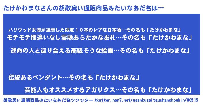 | 恥ずかしいあだ名 | 『たけっちょ』『タケカワマナデラックス』 |
